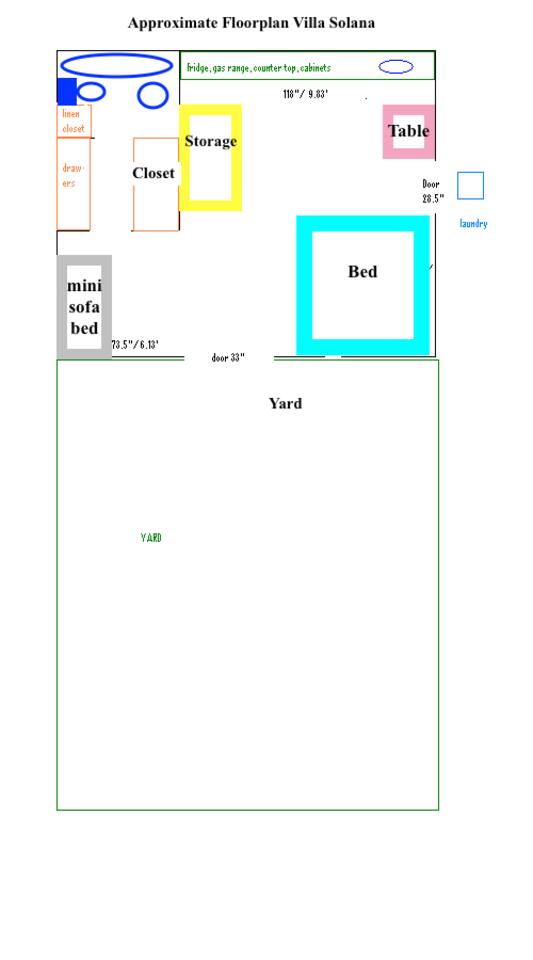 Villa Solana is a shabby-chic, vintage tiny-home. This little spot is a cottage-syle studio guest house with aprivate entrance and fenced patio. This property accepts only humble and respectful travelers who love dogs and cats and want to support Luckydog Sanctuary. The sofa bed is miniature (sofa approx 54"x31"; bed area 46.5"x80.5"). It sleeps two kids (or 1 small adult). Book up to 20 guests in adjacent homes for your family/friend reunion trip. Scroll down and message us for more information.