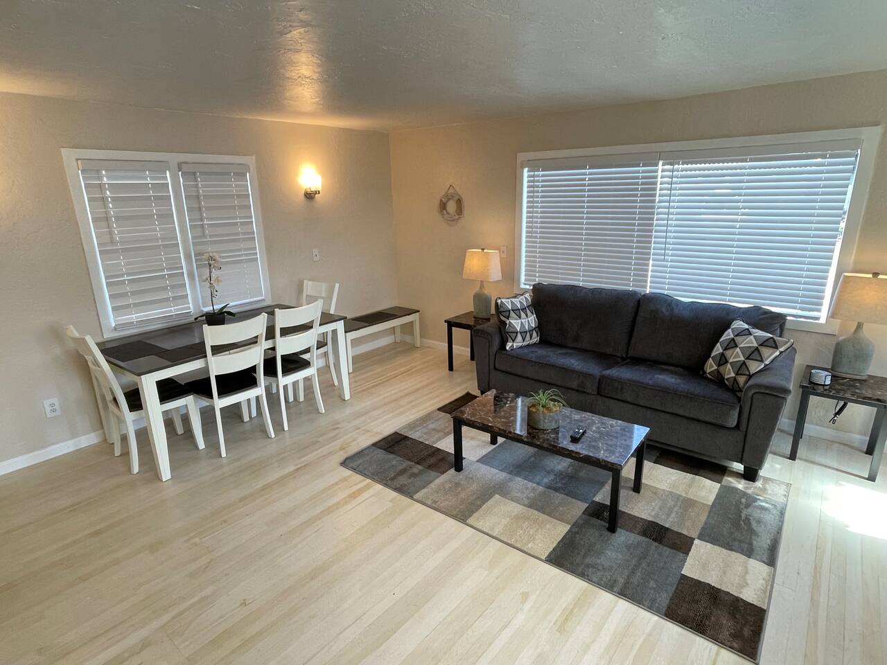 The areas pictured are included for your enjoyment. Please be respectful of our neighbors. Quiet time is 10PM until 10AM. Please don't be in the yard or patio areas after 10pm. There are 2 steps to get in the front door and no steps in the home. The back patio is about 5 steps down.