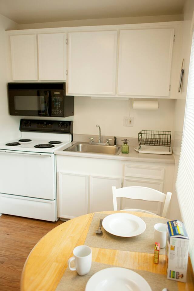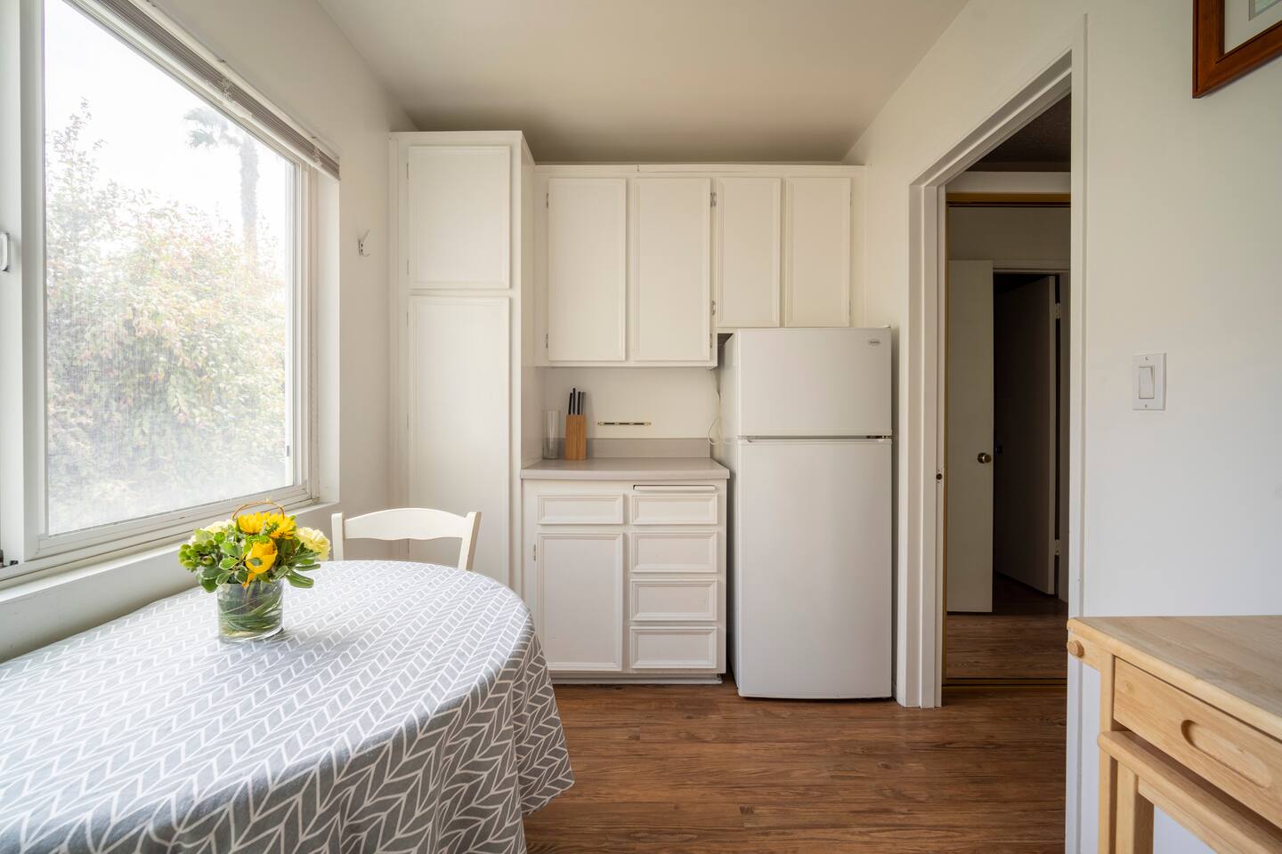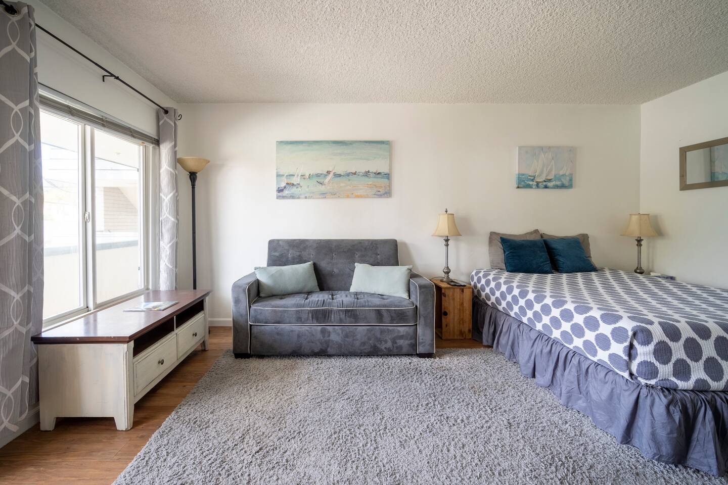The front room has a large window with a peek ocean view. Enjoy the awe of Windansea's glorious sunsets from the window or walk out on the breezeway for a magnificent panoramic view! Beach Breeze offers a full bathroom, a queen bed, and a full-size couch/bed (for specs search "Serta Convertible Sofa Sofabed, Java" at amazon ). Beach Breeze has a full kitchen that is separated from the living area by 2 doors and a hallway. The kitchen has a large window for fresh air. It has a standard-height table as well as rolling cart with stools that can be used as a standing or sitting desk.